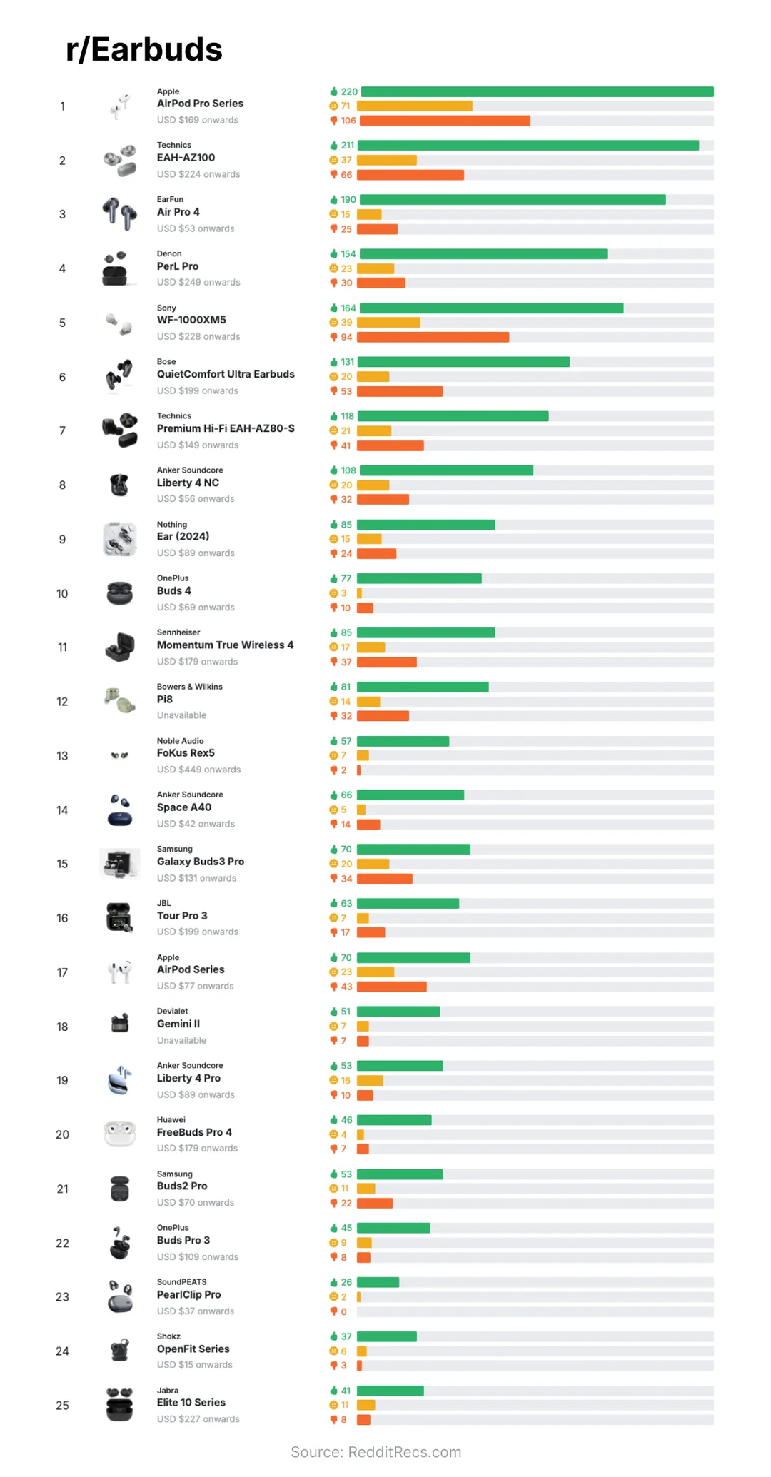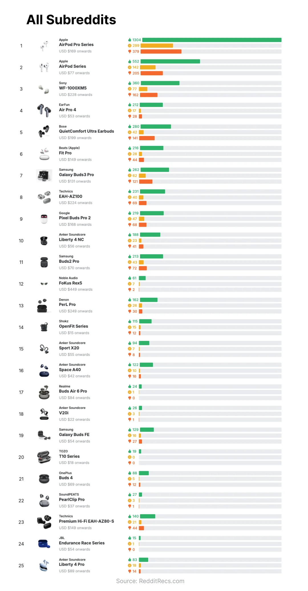 Итоги своей работы автор собрал в виде двух простых топов — в одном представлен рейтинг наушников на основе обсуждений в сабреддите r/Earbuds, в другом — рейтинг по всем сабреддитам сайта.