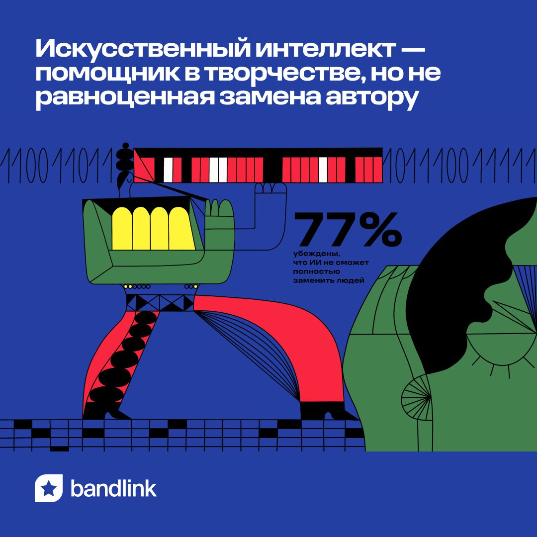 Небольшая часть исполнителей — 6% — подтвердила, что готова доверить алгоритмам весь творческий процесс. Тем не менее большинство опрошенных музыкантов сошлись во мнении, что искусственный интеллект должен быть только помощником в творчестве, а не полноценной заменой автору.