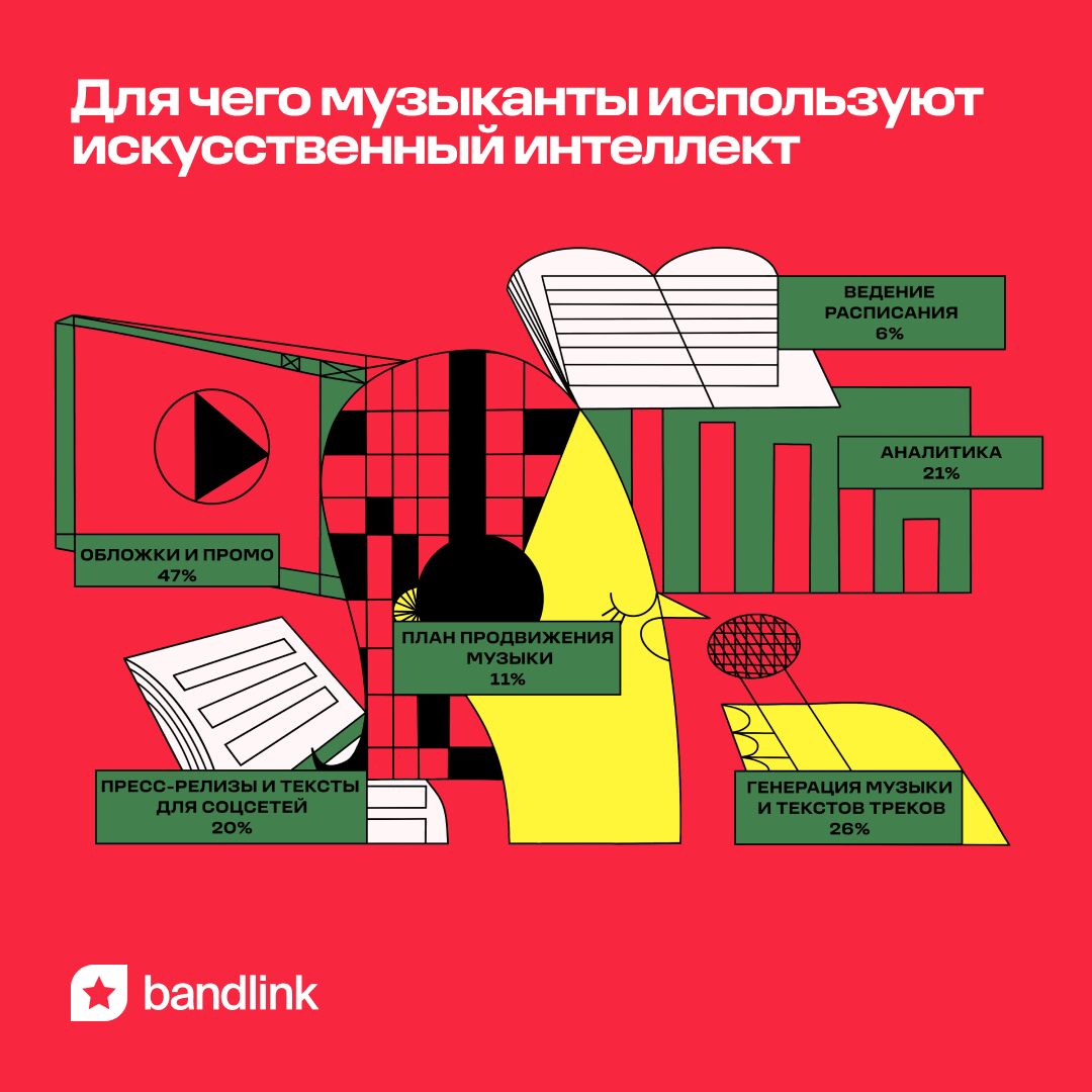 Чаще всего артисты обращаются к искусственному интеллекту для разработки обложек или промо-креативов (47%), а также для генерации инструменталов и текстов песен (26%). Пятая часть опрошенных (21%) применяет ИИ для аналитики творчества.