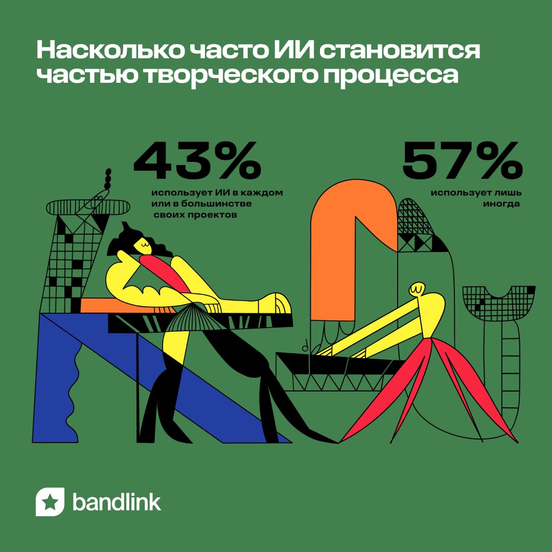 Согласно опросу, почти половина музыкантов (43%) применяет ИИ в каждом или большинстве проектов, остальные — от случая к случаю. Среди самых популярных инструментов у музыкантов — ChatGPT, Алиса AI, Midjourney, Шедеврум, DeepSeek, а также создания аранжировок, например Suno AI и другие.