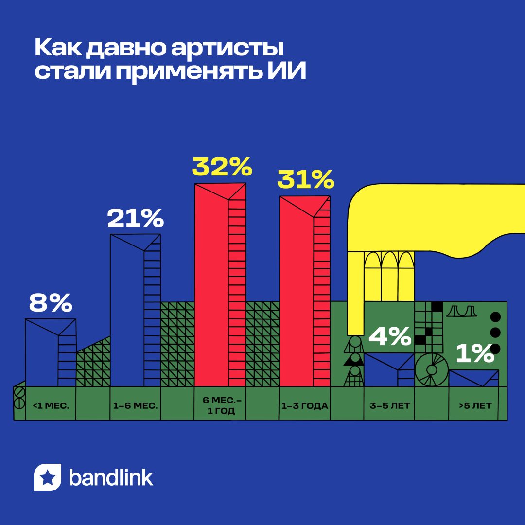На практике нейросети уже прочно вошли в ключевые рабочие процессы представителей музыкальной индустрии: сегодня две трети профессиональных музыкантов (67%) используют инструменты на базе искусственного интеллекта. Проникновение ИИ в музыку происходит стремительно: 61% артистов, использующих такие инструменты, освоили их за последний год, в том числе 8% — за последний месяц до опроса.