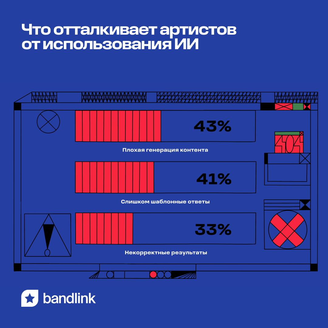 В числе негативных факторов респонденты чаще всего выделяют ошибки при генерации контента (43%), слишком шаблонные ответы (41%) и некорректные результаты (33%). Некоторые музыканты отметили, что освоение ИИ требует много времени и ресурсов.
