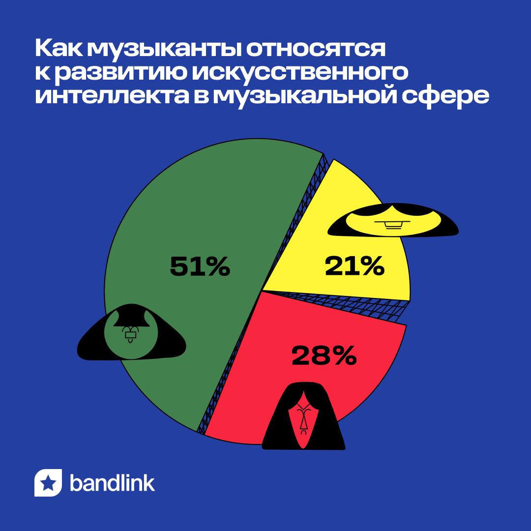 Более 70% российских музыкантов положительно относятся к применению искусственного интеллекта в музыке. К такому выводу пришли сотрудники BandLink в ходе проведённого исследования использования нейросетей среди исполнителей и авторов.