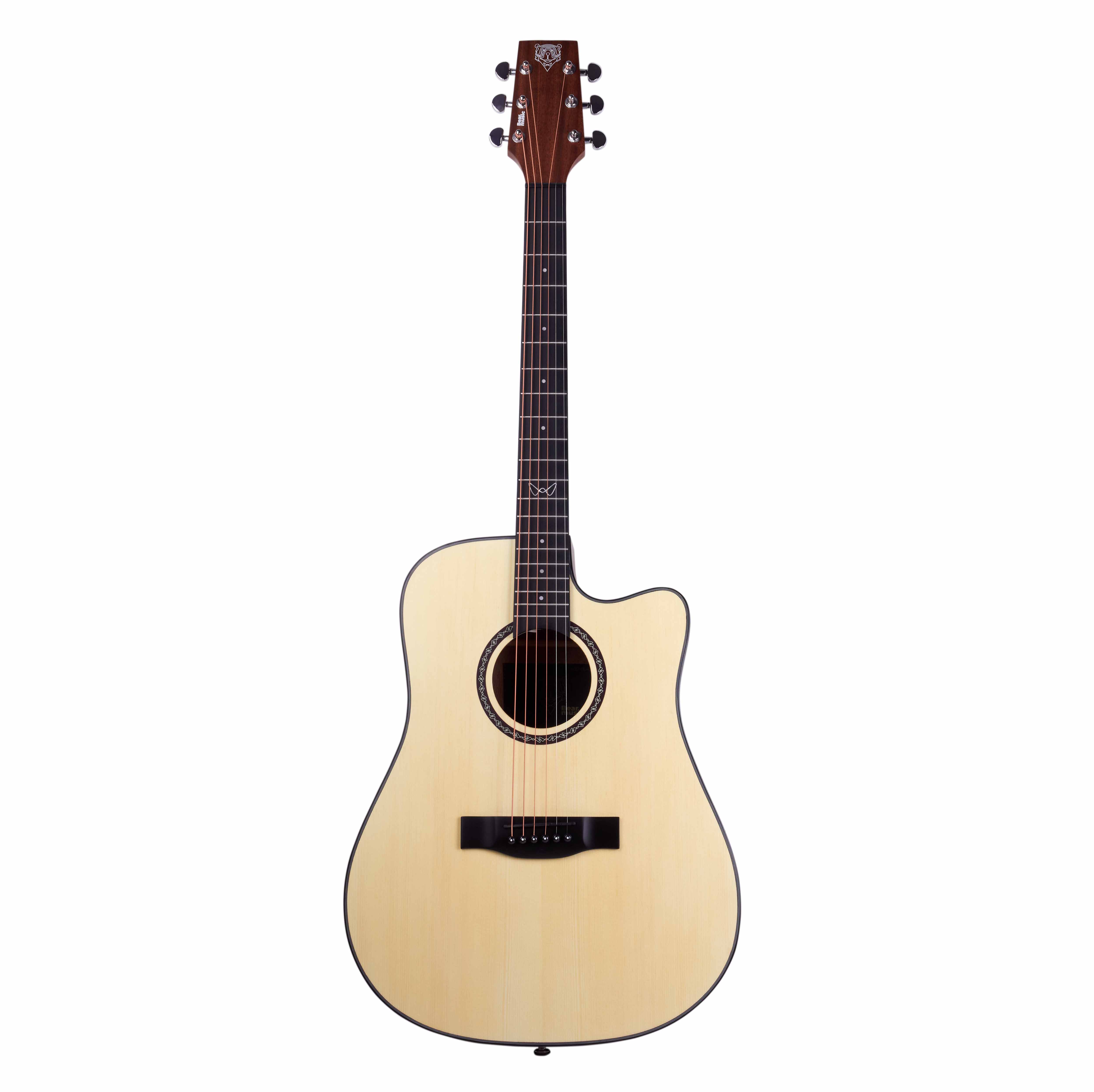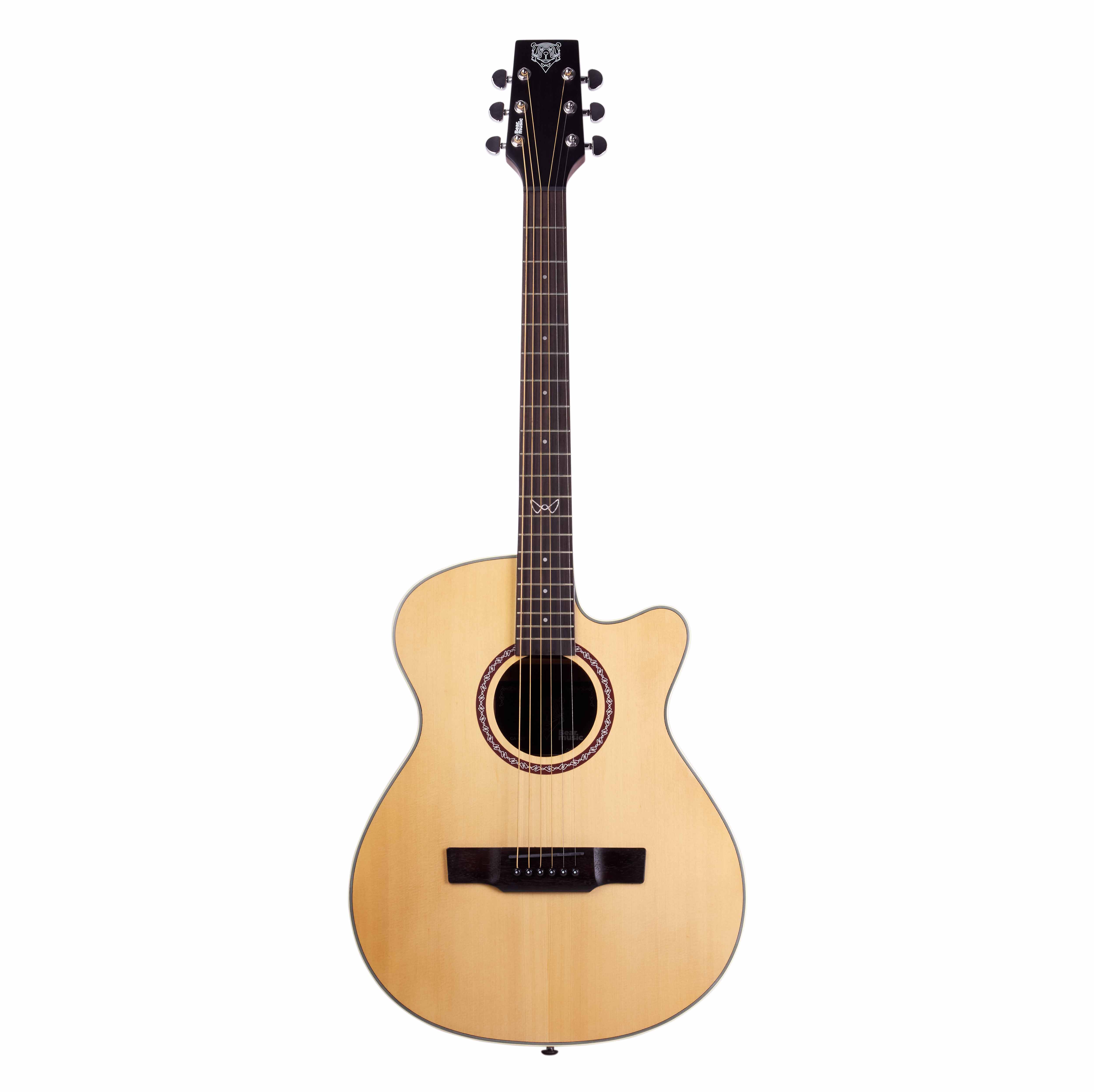 Верхняя дека выполнена из массива ели класса «А» — гитара обещает яркое и насыщенное звучание с хорошей динамикой. Нижняя дека и обечайка из ореха добавляют плотности и ясности звуку.