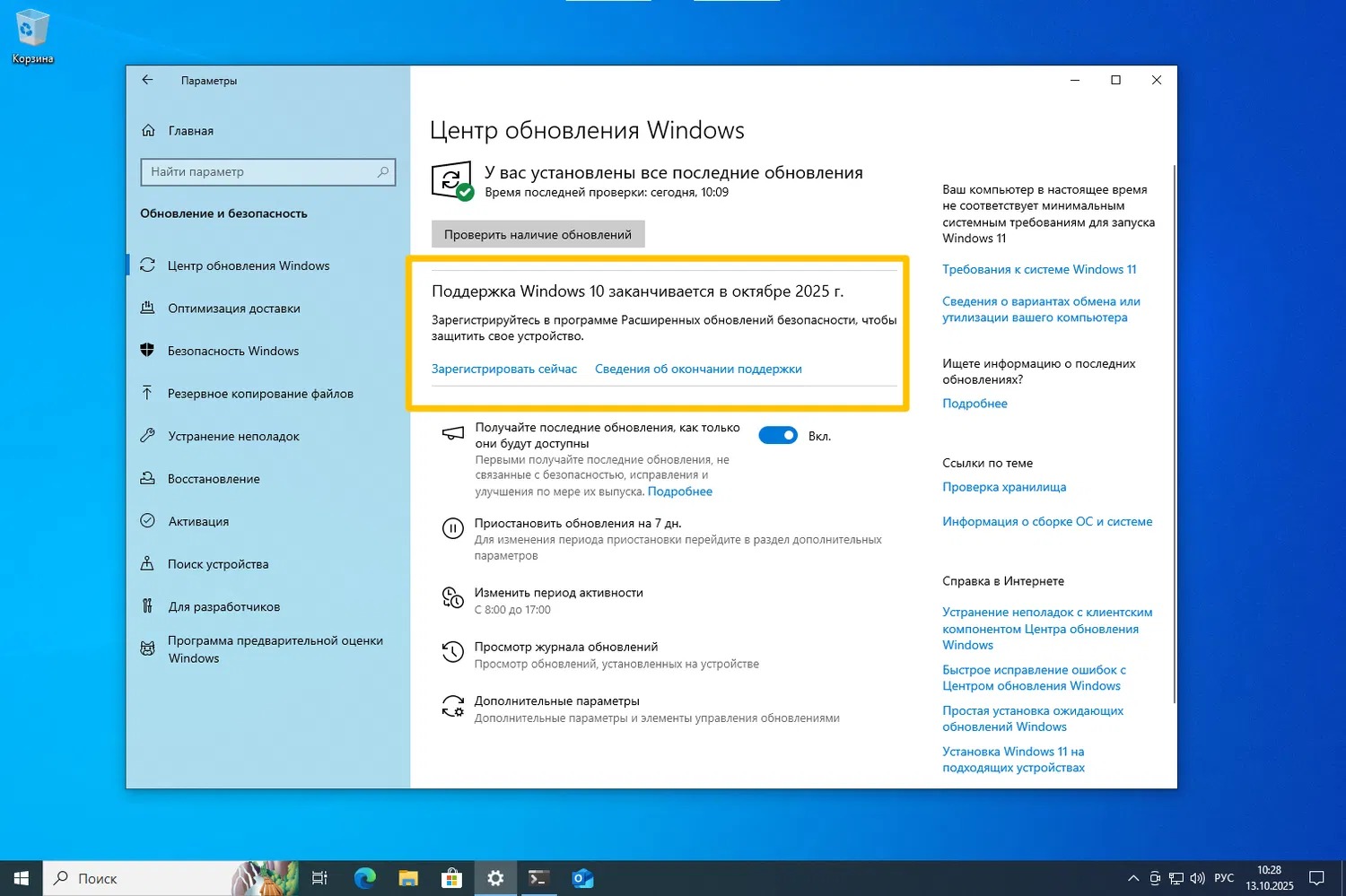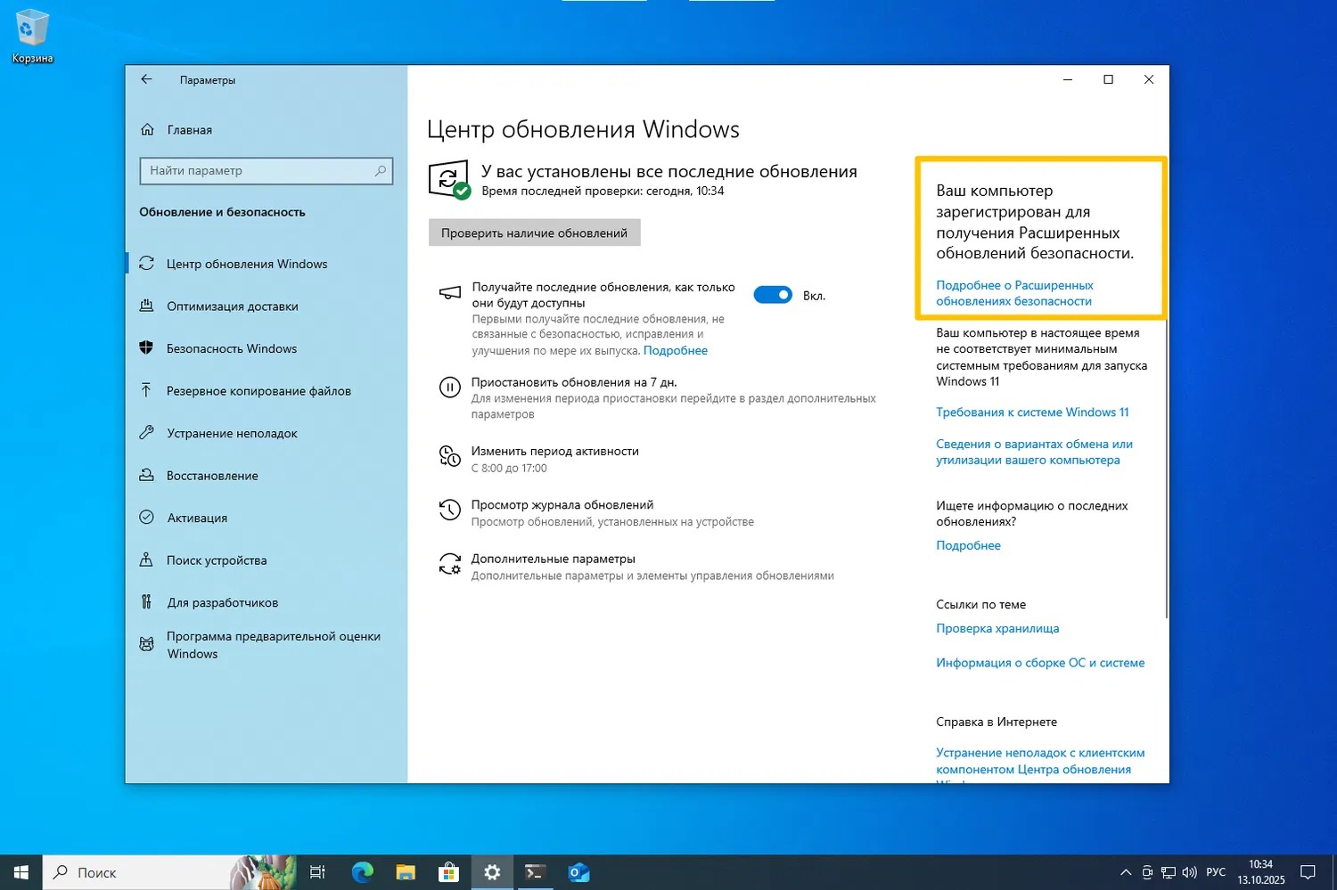 После смены региона необходимо перезагрузить компьютер и зайти в «Центр обновления Windows», чтобы проверить, что на устройстве установлена самая актуальная версия операционной системы. Там же появится сообщение «Поддержка Windows 10 заканчивается в октябре 2025 года», под которым располагается кнопка «Зарегистрироваться сейчас». Нажатие на неё зарегистрирует пользователя в ESU.
