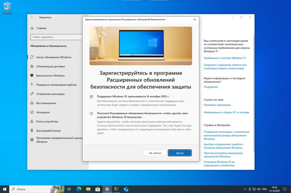 Тем, кто не хочет или не может перейти на Windows 11, рекомендуют зарегистрироваться в программе расширенных обновлений безопасности ESU — Extended Security Updates. Участники программы получат дополнительный год технической поддержки, который завершится 13 октября 2026 года.