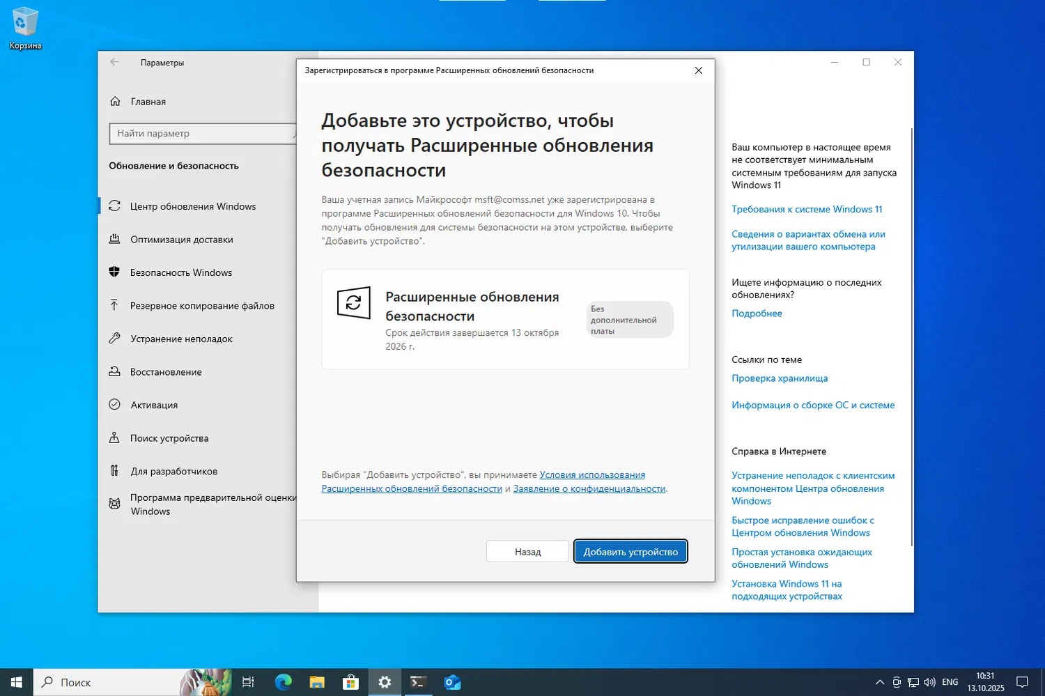 Для участия в ESU понадобится ввести учётную запись Microsoft, использующуюся на устройстве. Для одной учётной записи доступно добавление 10 устройств в программу расширенной поддержки.