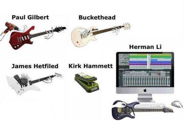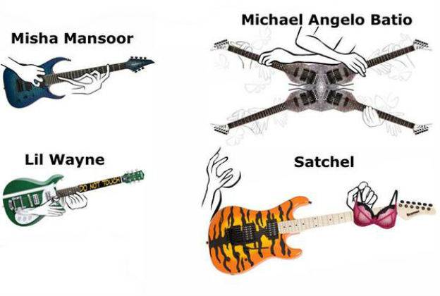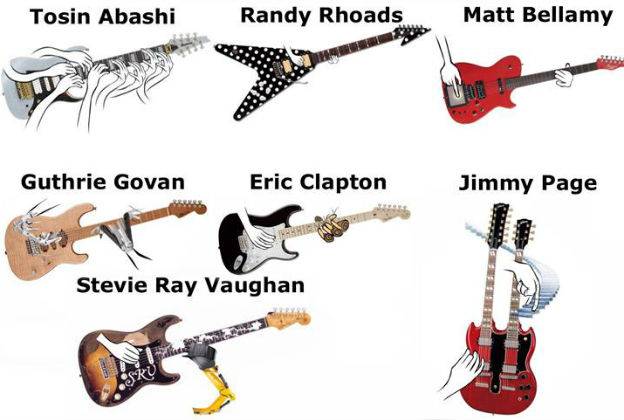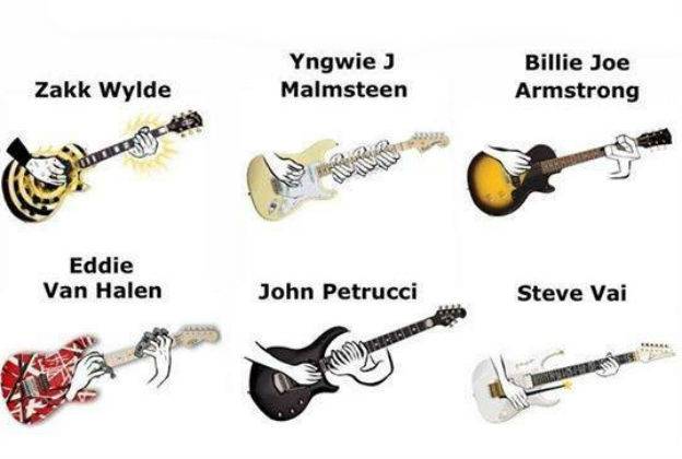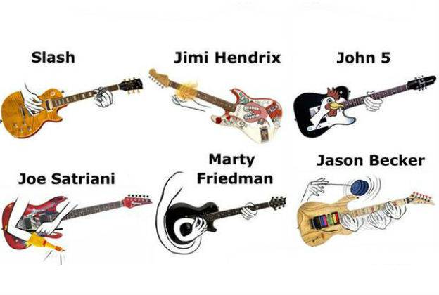 При игре на гитаре, важное значение имеет постановка рук. Художник под псевдонимом GuitarManComic создал серию карикатур, в которых он попытался отобразить свое видение того, как это делают известные гитаристы.